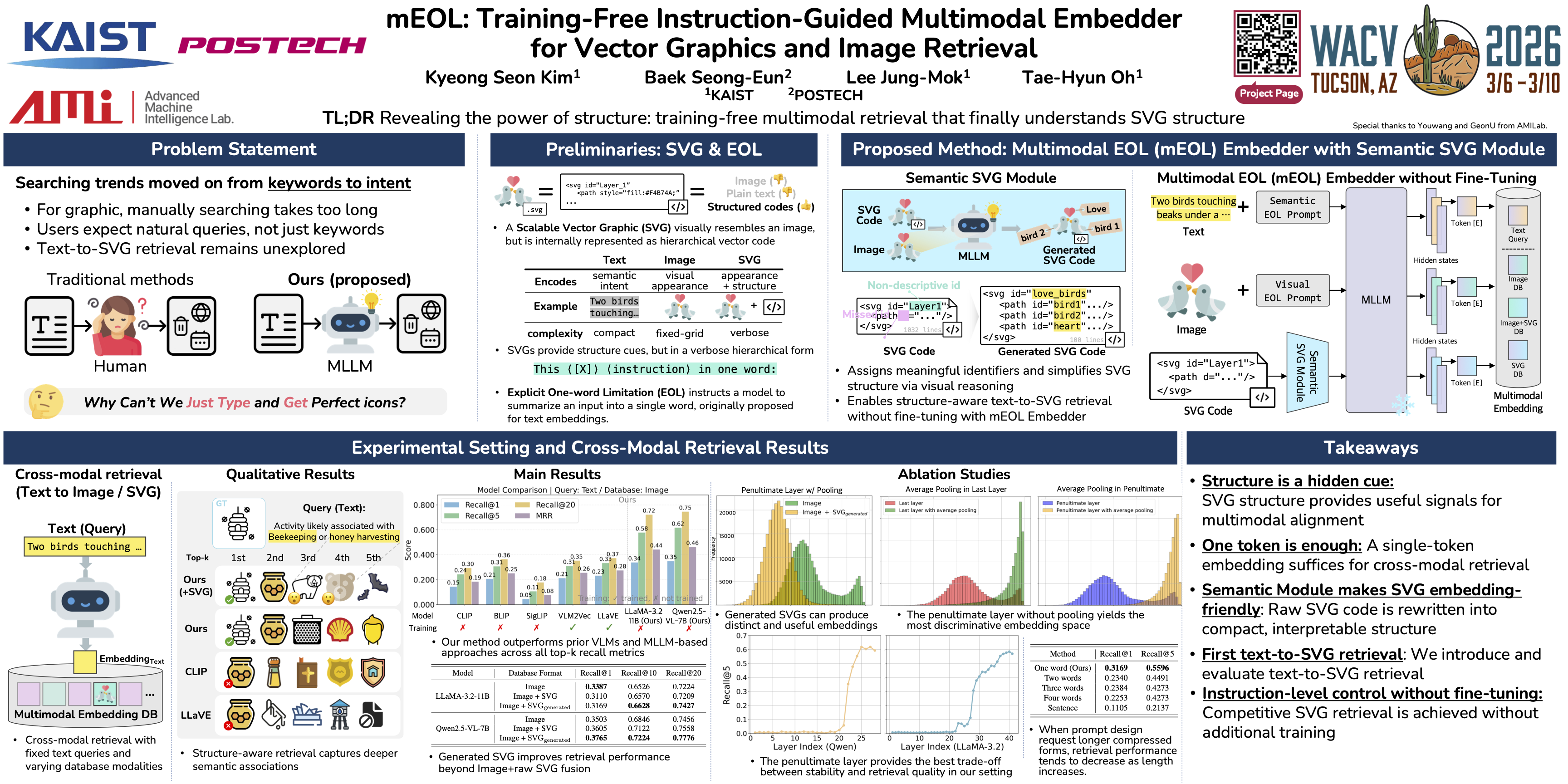 While Scalable Vector Graphic (SVG) codes appear as either plain text or visually as images, they are structured representations that encode geometric and layout information. However, existing methods typically convert SVGs into raster image, discarding their structural details. Similarly, previous sentence embedding methods generate high-quality text embeddings but do not extend to structured or visual modalities such as SVGs. To address these challenges, we propose the first training-free multimodal embedding method that uses a Multimodal Large Language Model (MLLM) to project text, images, and SVG code into an aligned space. Our method consists of two main components: (1) multimodal Explicit One-word Limitation (mEOL), which produces compact, semantically grounded embeddings across modalities without training; and (2) a semantic SVG module that rewrites SVG code by generating missing or non-descriptive components through visual reasoning. This lets the model embed structural signals overlooked in prior work. Our approach not only introduces the first SVG retrieval setting but also achieves strong empirical performance, surpassing prior methods including training-based models by up to +20.5% Recall@1 on a repurposed VGBench dataset. These results demonstrate that structural cues can significantly enhance semantic alignment in multimodal embeddings, enabling effective retrieval without any fine-tuning.